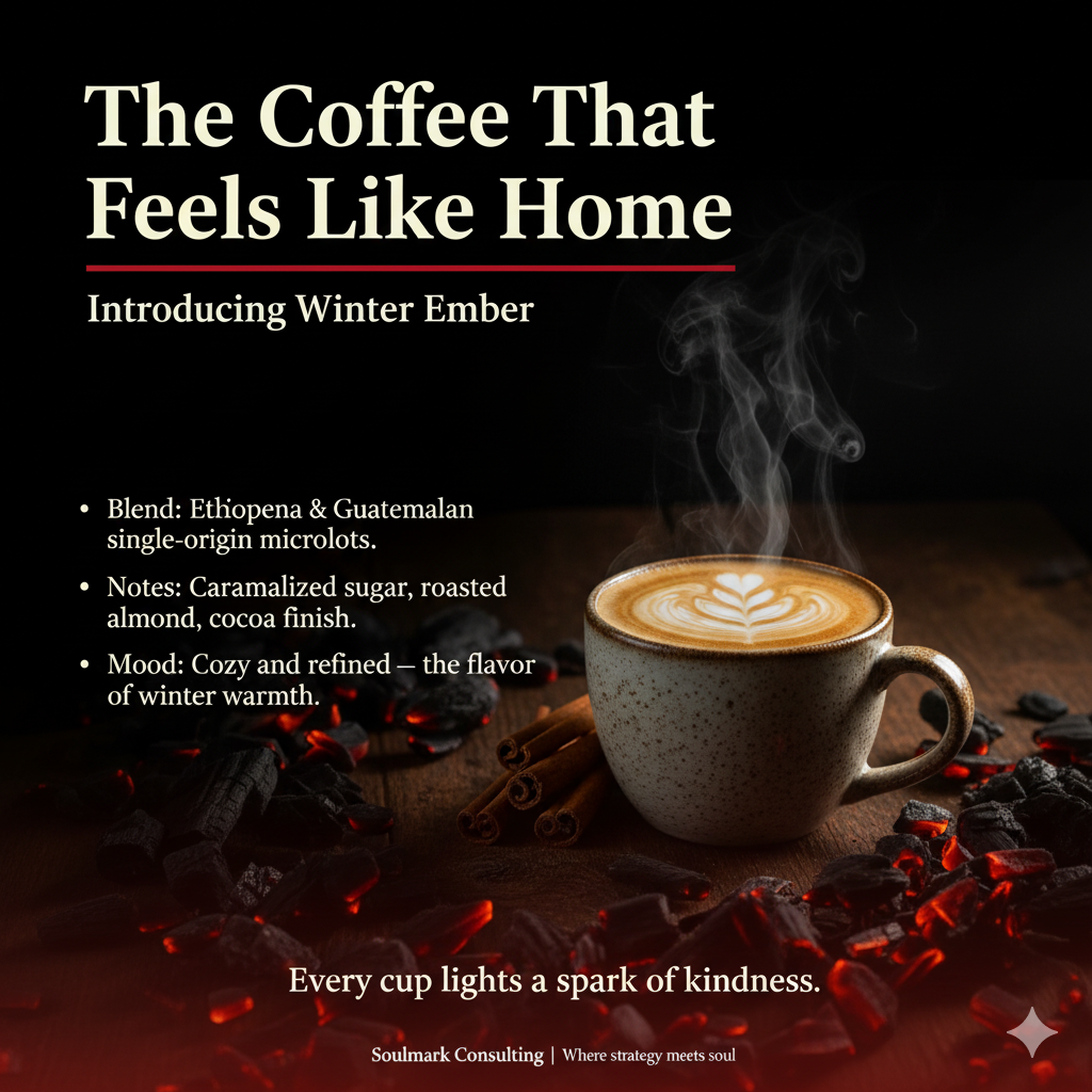 Winter Ember was crafted to evoke the glow of embers on a cold evening — a perfect blend of Ethiopian single-origin beans with notes of peach, black tea, and honey.