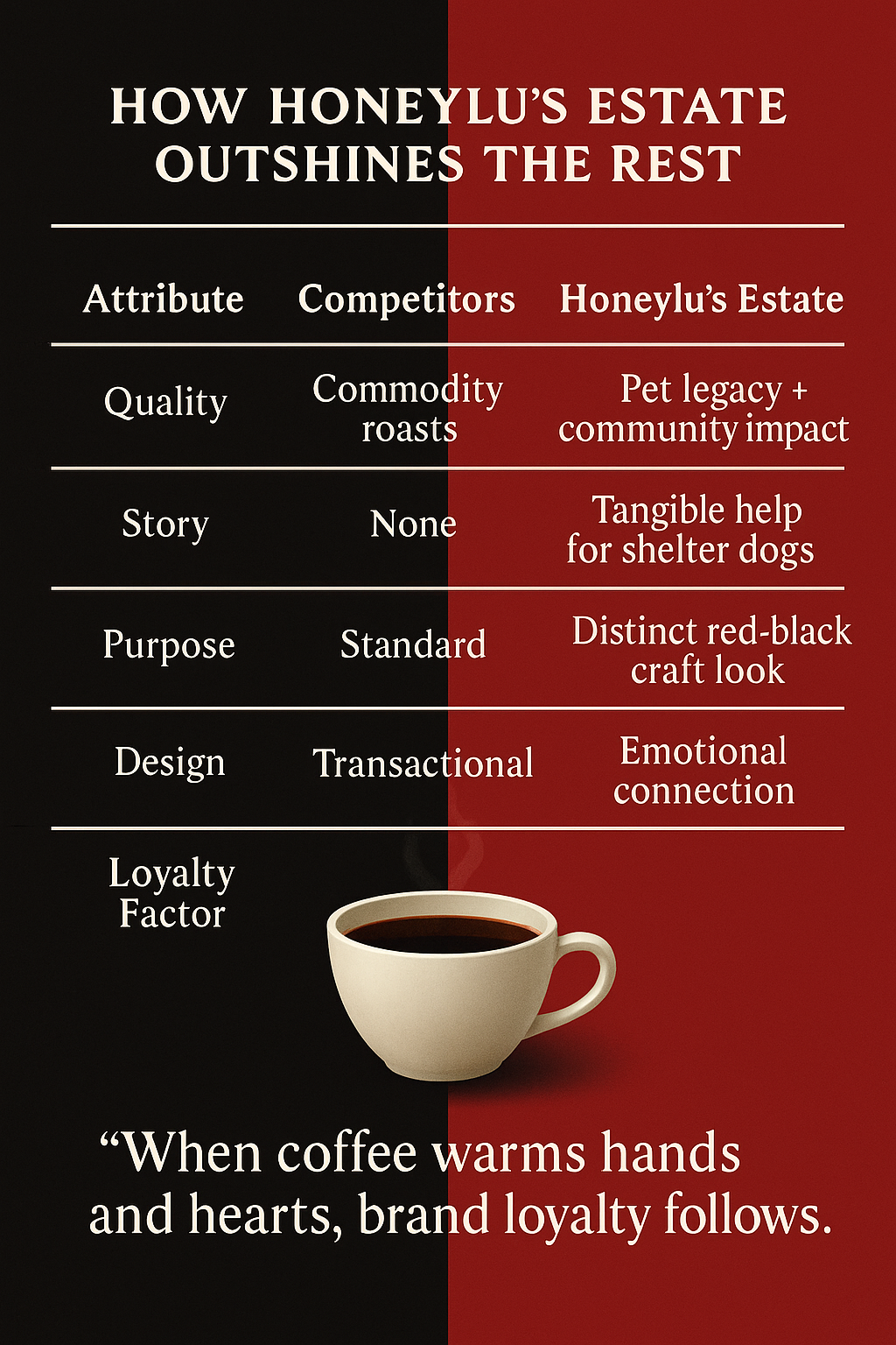 Inspired by artisanal micro-lot roasts, I developed a premium aesthetic for Honeylu’s Estate — rich black packaging, warm copper typography, and a provenance label that highlights origin, tasting notes, and craft.